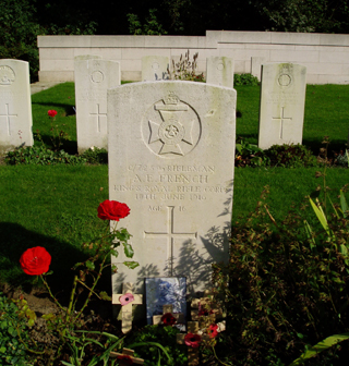 Grave in Hagle Dump Cemetery of No 202893 Private George Ainley 1/4th KOYLI executed 30th July 1918 for desertion. Private Ainley had been tried on 28th January 1918 for a self inflicted wound but before the end of the Summer of 1918 he had deserted three times. The Courts Martial was apparently on the 13th July and was for the three offences of desertion. The Commanding Officer of the Battalion submitted a report for the Court; “Private Ainley appears to be lacking a sense of responsibility, and his military character in consequence is not good.” He was executed on the 30th July 1918 when he was 20 years of age and almost certainly a conscript originally from Sheffield.